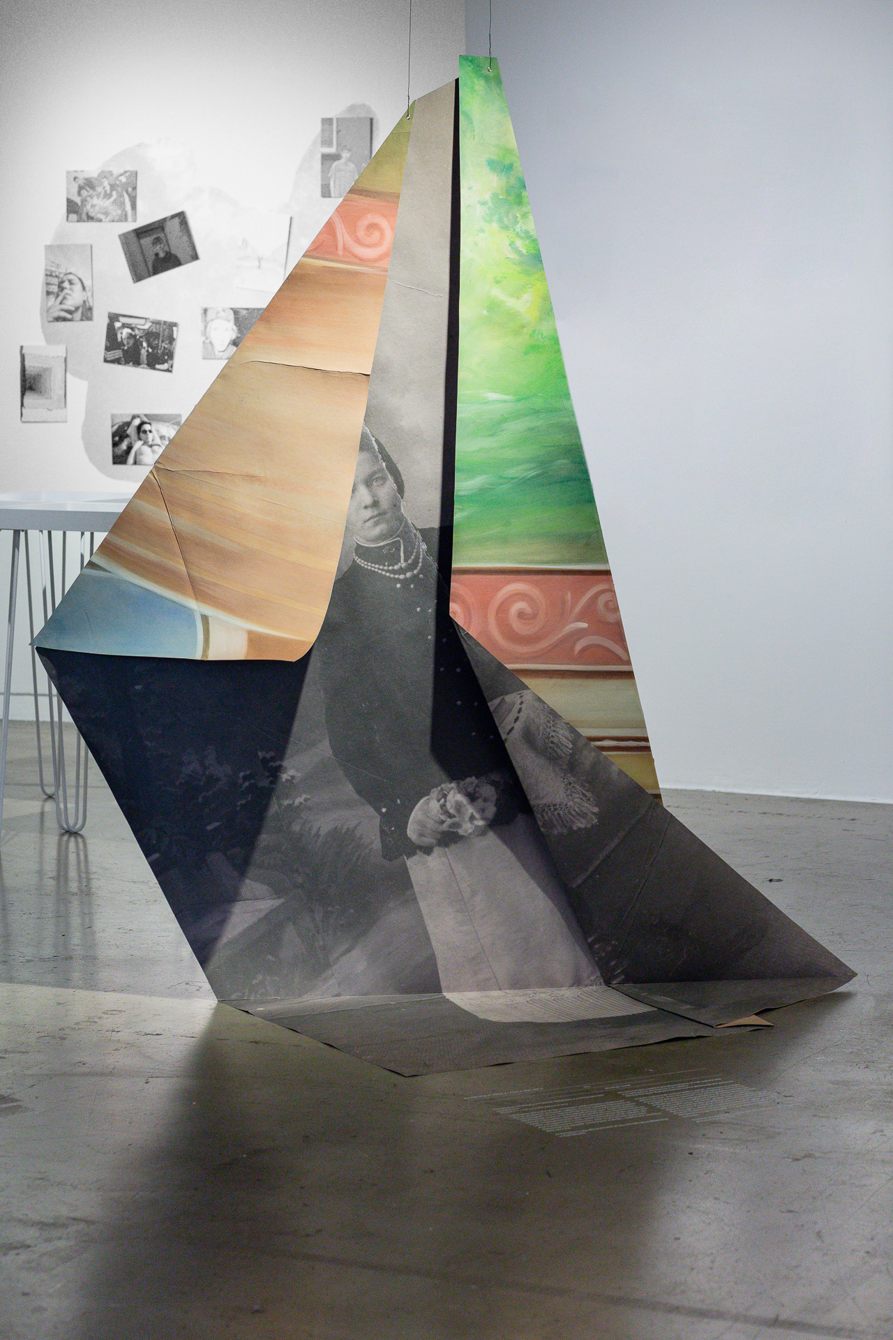 In their festive folk costume — jakla, apron, depending on their places of birth, they are posing for photographs. Behind the women, landscapes painted onto photographic backdrops, furnishing collective representations of social advancement, of finding oneself in a different, better space — in a palace, an aristocratic salon, a French garden. The photography is not intended to put their life on display, quite the opposite. Blue air without a trace of pollution, vivid colours, the atmosphere of an idyll, though in close up — the painting appears rather unsophisticated. There is a certain dissonance here. The identity is declared through the outfit, the place is conventional: anywhere but here.